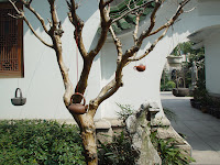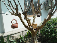 拱門左右各有一顆樹,多只砂壺器很巧思地就在樹上吊掛著,顯得生氣盎然,